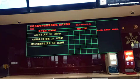 某影城的LED屏可以任意點陣顯示多語種字體,靈活地以多種方式進入和退出顯示,可以顯示各種表格,表內數據可通過專用的軟件人工輸入和更改,也可以利用編輯軟件將文字、圖片、表格進行組合,迭加顯示。可采集計算機內的當前時間,并適時分幅顯示,月、日、星期、時、分、秒等。